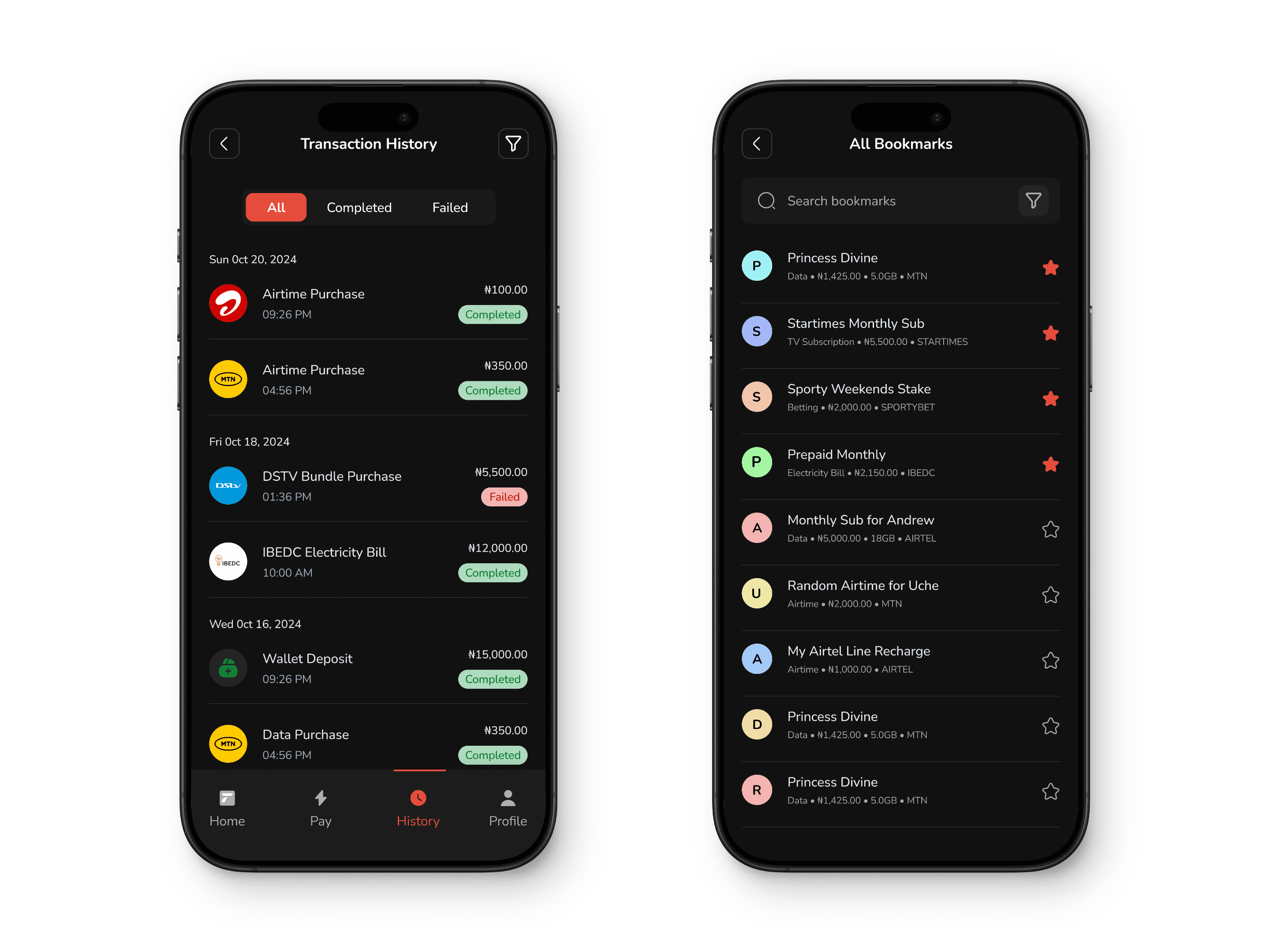 Repeating transactions to the same beneficiaries are common. To make this experience easier for users, there is a bookmark option so they can initiate the same transaction any time once they have it saved.