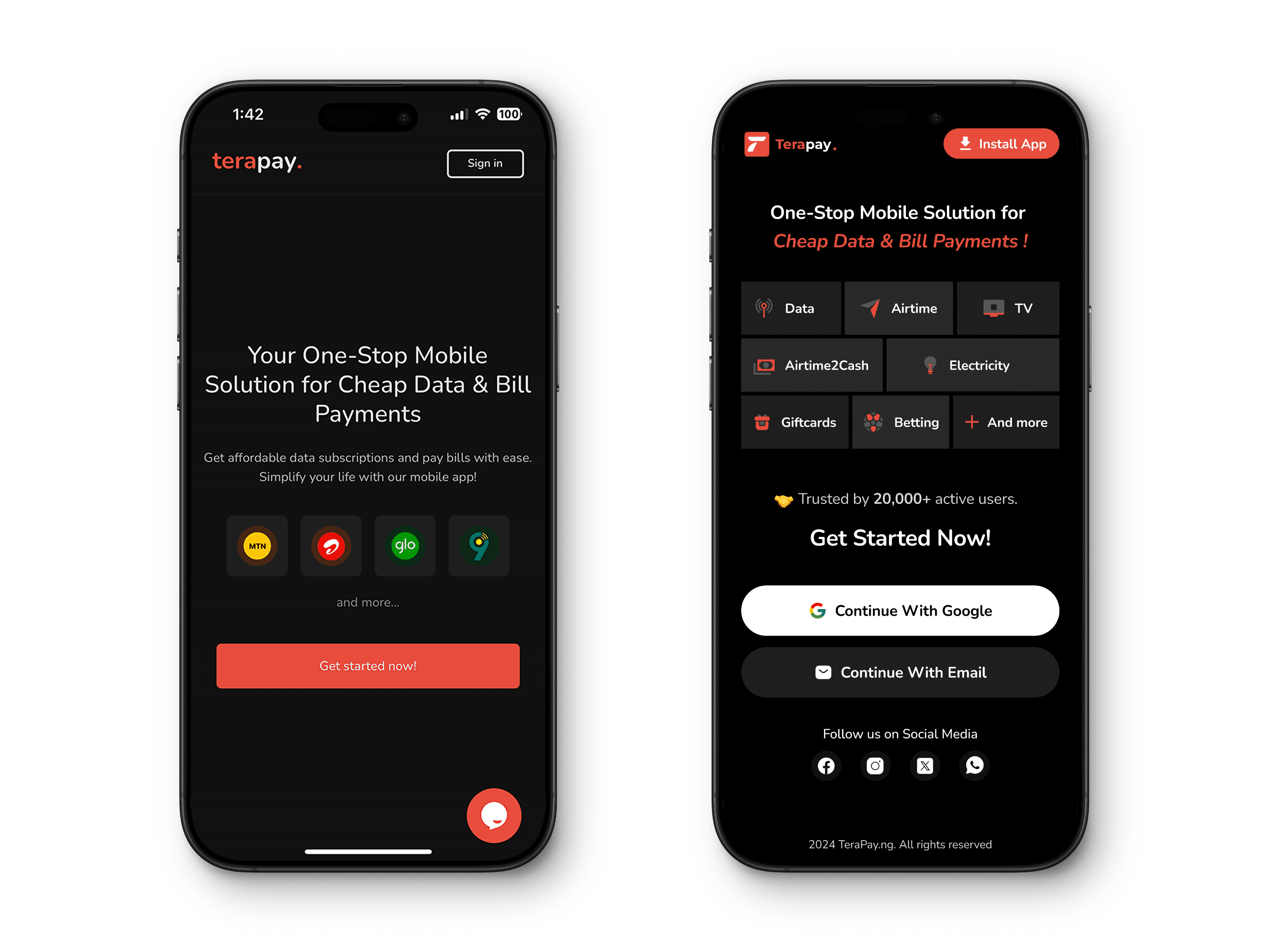 The landing page was redesigned to highlight Terapay’s expanded services beyond airtime recharge (as seen in the 'Before' version). I also incorporated social proof (the number of active users) and instant access to signup options through Google and email, for a faster and more user-friendly experience.